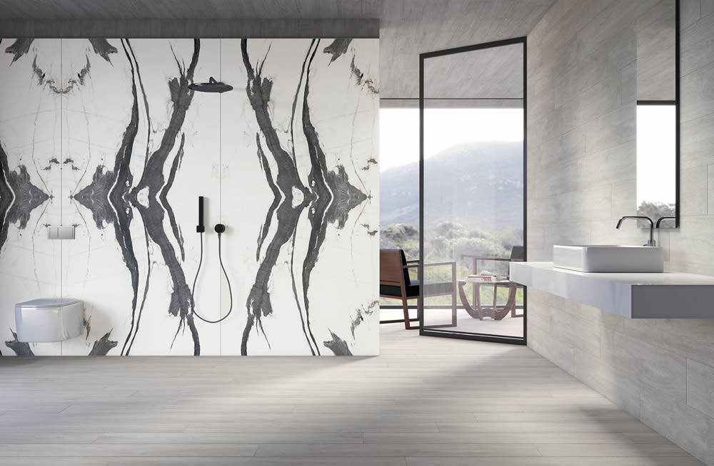 Alavya: Eğer beyaz bir alan gözünüze fazlaca ışıltılı geldiyse, tezat renklerin harmonisinden faydalanarak hareketli döşemeler çeşitlilik ekleyebilirsiniz. Çarpıcı bir Hollywood Regency tarzı için size önerimiz NG Kütahya Seramik’in Bookmatch Koleksiyonu’nun yıldızlarından 120x240 cm ölçüsündeki Alavya. Beyaz üzerinde dans eden siyah çizgileriyle siyah ve beyazın kombinasyonunu banyonuza zarafetle taşıyacak.