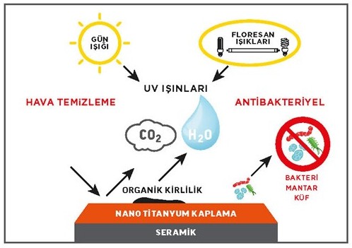 NG Smart’ın yüksek teknolojisi ve akıllı çözümleri ile zamanla kirletici etki yapan maddeler yüzeyde tutunamaz. Fotokatalitik mekanizma UV ışınların etkisiyle işlevsel hale geçerek hidrofilik seramik yüzeyindeki, kir ve lekeleri parçalayarak yok eder ve karbondioksit ile su bileşenlerine dönüştürür. Fotokatalitik kaplama yardımı ile organik kirlilikler, düşük su ve iş gücü ile kolayca yüzeyden uzaklaştırılır. Sürdürülebilir Kalkınma için enerji tasarrufuna katkı sağlar.